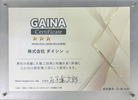 GAINAの製造元である㈱日進産業の認定施工店でしか取り扱えない製品です。